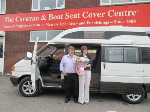 The image above is of Mr & Mrs Bendall from Scotland who booked their motorhome in with us to have a full re-upholster. They drove the 'van down to us and flew home! When they collected the vehicle a couple of weeks later, we presented them with a bouquet as they'd beaten the record for the furthest distance a visitor had driven to us… a massive 824 mile round trip!